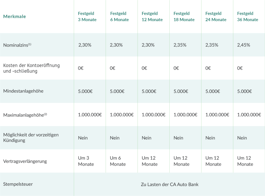 Aktuell gültige Konditionen der CA Auto Bank S.p.A., Corso Orbassano 367, 10137 Turin, Italien für die Eröffnung eines kostenfreien Online-Festgeldkontos zu einem festen Zinssatz für die vereinbarte Laufzeit. Verbrauchern steht ein Widerrufsrecht von 14 Tagen zu.